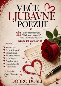 Veče ljubavne poezije večeras u Narodnoj biblioteci “Radosav Ljumović” u 19 časova