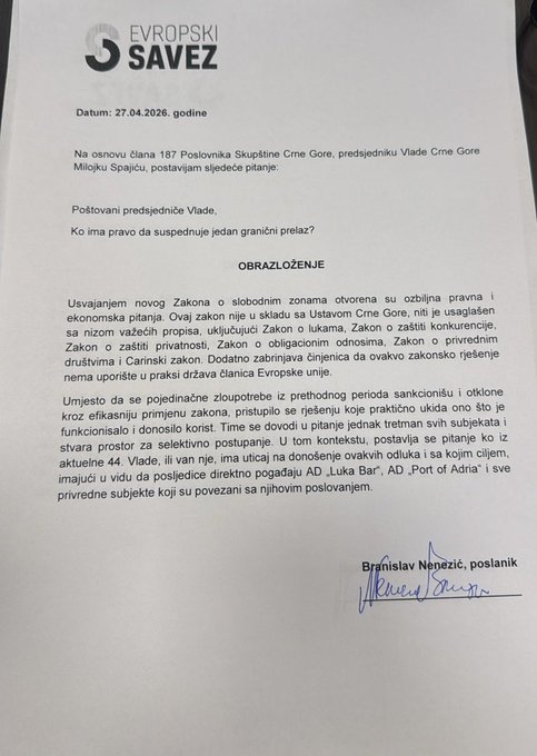 Nenezić je zapitao koji član 44. Vlade radi za interese luke Drač i ocijenio da je predloženi Zakon o slobodnim zonama nije u skladu sa Ustavom Crne Gore.