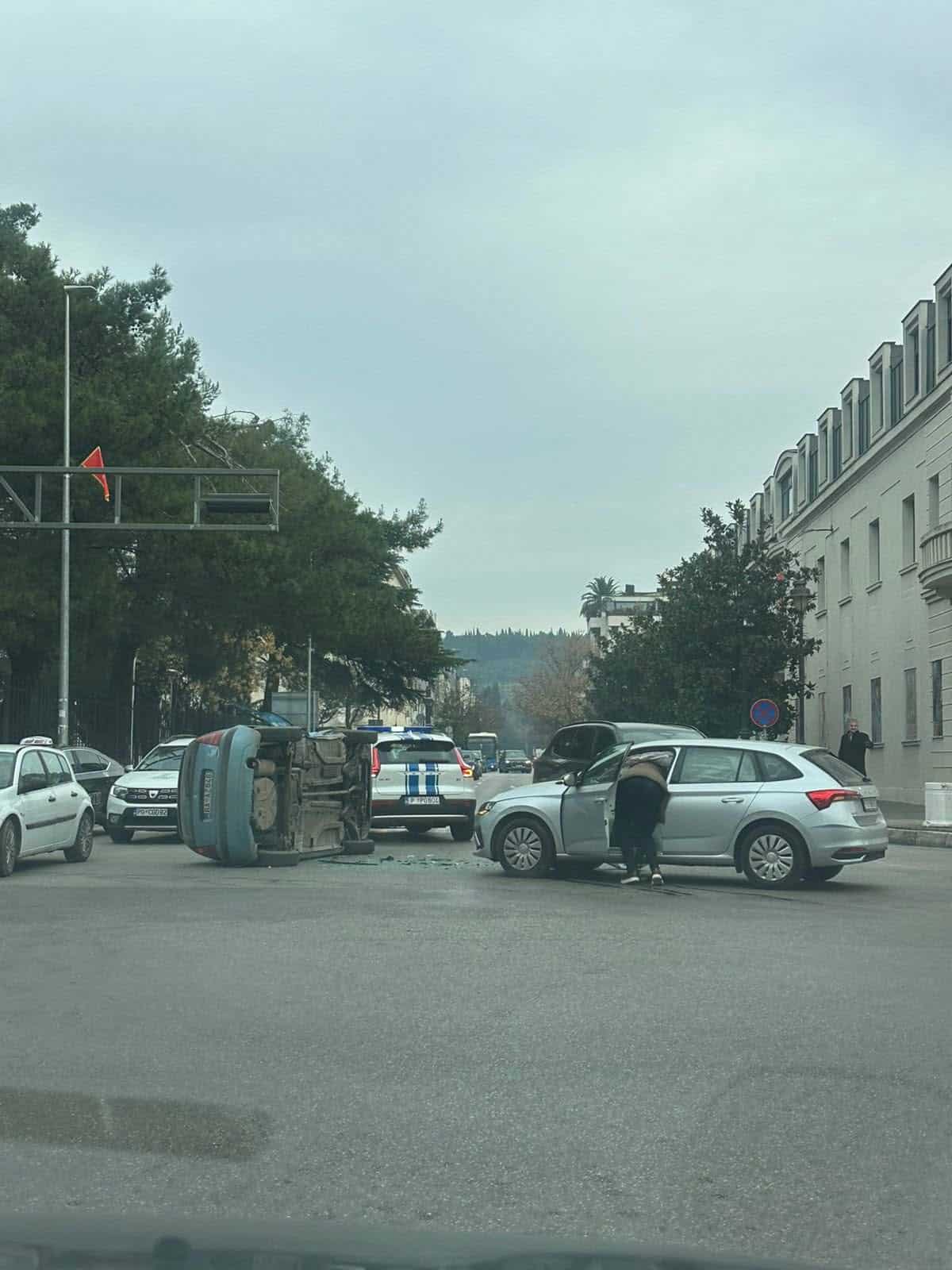 Kako se vidi na fotografijama, u udesu su učestvovala dva vozila, od kojih se jedno prevnulo na krov.