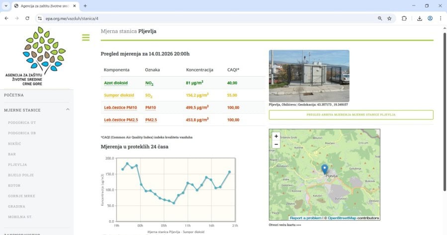 U 20 časova na stanici u naselju Gagovića imanje izmjereno je 499,5 µg/m3 PM10 čestica. Iznad dozvoljene granice su i PM2,5 čestice koje se smatraju još opasnim i njihova koncentracija iznosila je 453,8 µg/m3.