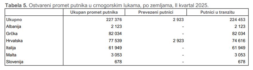 U crnogorskim lukama u drugom kvartalu 2025. godine ostvaren je ukupni promet od 227,4 hiljade putnika, što predstavlja blagi rast u odnosu na isti period prošle godine. Struktura prometa pokazuje da je gotovo cjelokupni broj putnika došao u tranzitu (224,5 hiljada), dok je svega 2,9 hiljada evidentirano kao prevezeno.