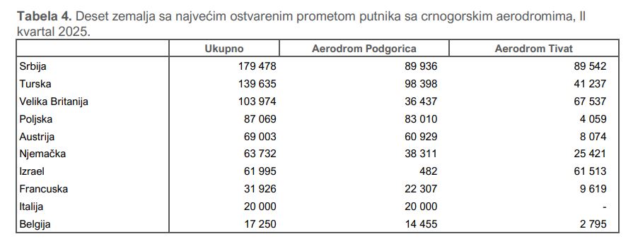 Kada je riječ o avio-saobraćaju, Srbija i dalje drži primat – gotovo svaki peti putnik koji je ušao ili izašao iz Crne Gore avionom dolazi upravo sa letova iz Srbije. Turska je odmah iza, dok se na trećem mjestu našla Velika Britanija. Među prvih deset zemalja po prometu nalaze se i Poljska, Austrija, Njemačka, Izrael, Francuska, Italija i Belgija.