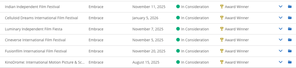 Šesta nagrada u nizu za spot „Embrace“ osvojena je na globalnom onlajn festivalu „Celuloid dreams international film festival“ 5. januara tekuće godine.