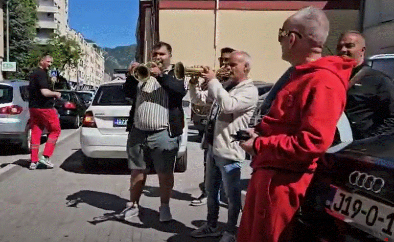 Veselje je počelo u jednom mostarskom kafiću, a uz zvuke trube i harmonike, Mostarac i njegovo društvo su svratili na burek u poznatu buregdžinicu.