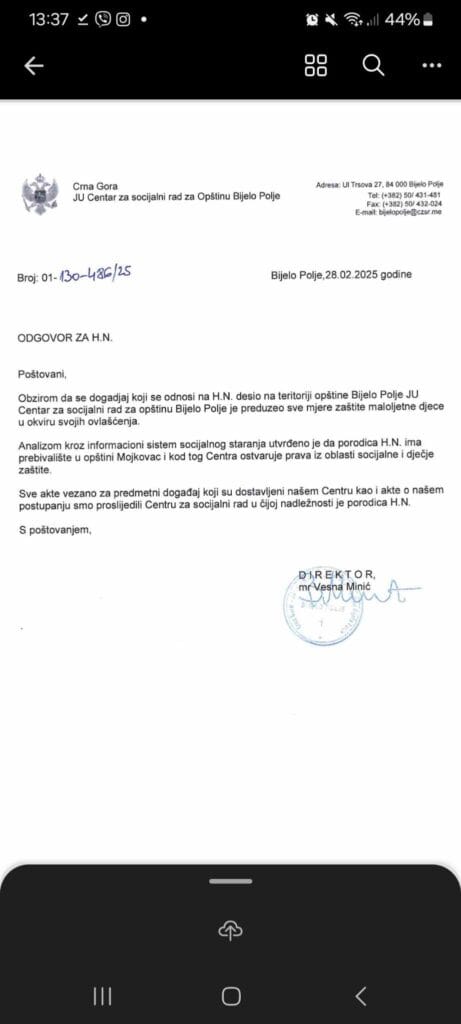 Centar za socijalni rad u Bijelom Polju, na koji je više puta apelovano da se uključi u slučaj, te ispita uslove u kojima odrastaju maloljetna djeca, ipak nije nadležan na ovaj slučaj. Od strane direktorice Vesne Minić, obaviješteni smo da Hristina Nedović i njena djeca imaju prijavljeno prebivalište u opštini Mojkovac, pa je stoga tamošnji centar za socijalni rad dužan da ispita sve okolnosti ovog nesvakidašnjeg slučaja.
