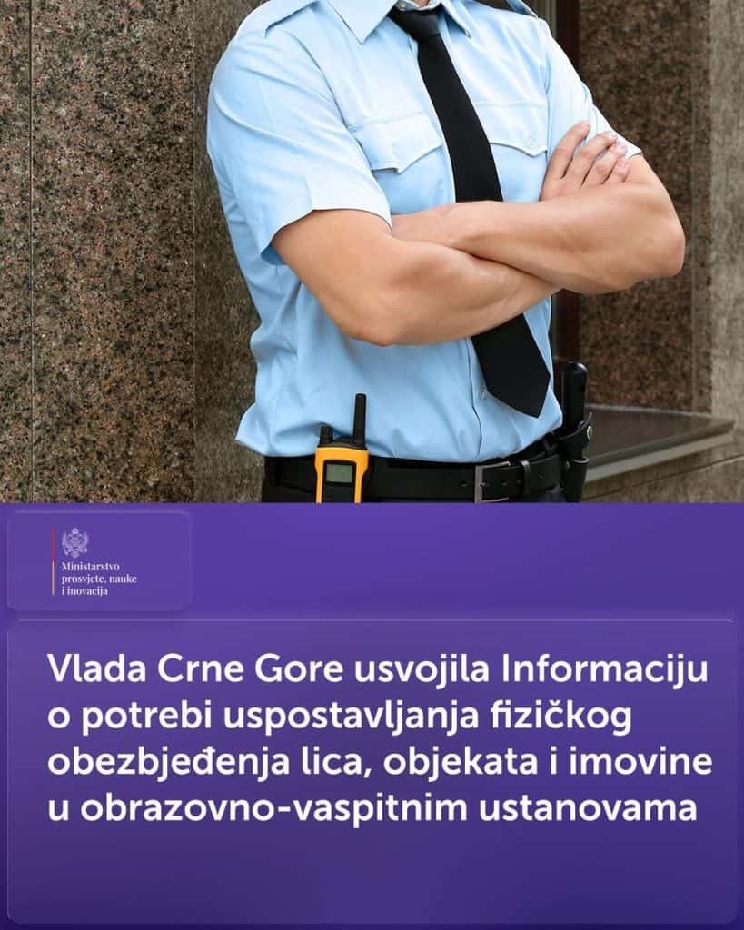 “Vlada Crne Gore je na sjednici održanoj 22. januara 2026. godine usvojila Informaciju o potrebi uspostavljanja fizičkog obezbjeđenja lica, objekata i imovine u obrazovno-vaspitnim ustanovama, koju je pripremilo Ministarstvo prosvjete, nauke i inovacija, čime se nastavlja praksa angažovanja fizičkog obezbjeđenja u obrazovno-vaspitnim ustanovama širom zemlje po modelu koji se i ranije pokazao djelotvornim”, navode u tom resoru.