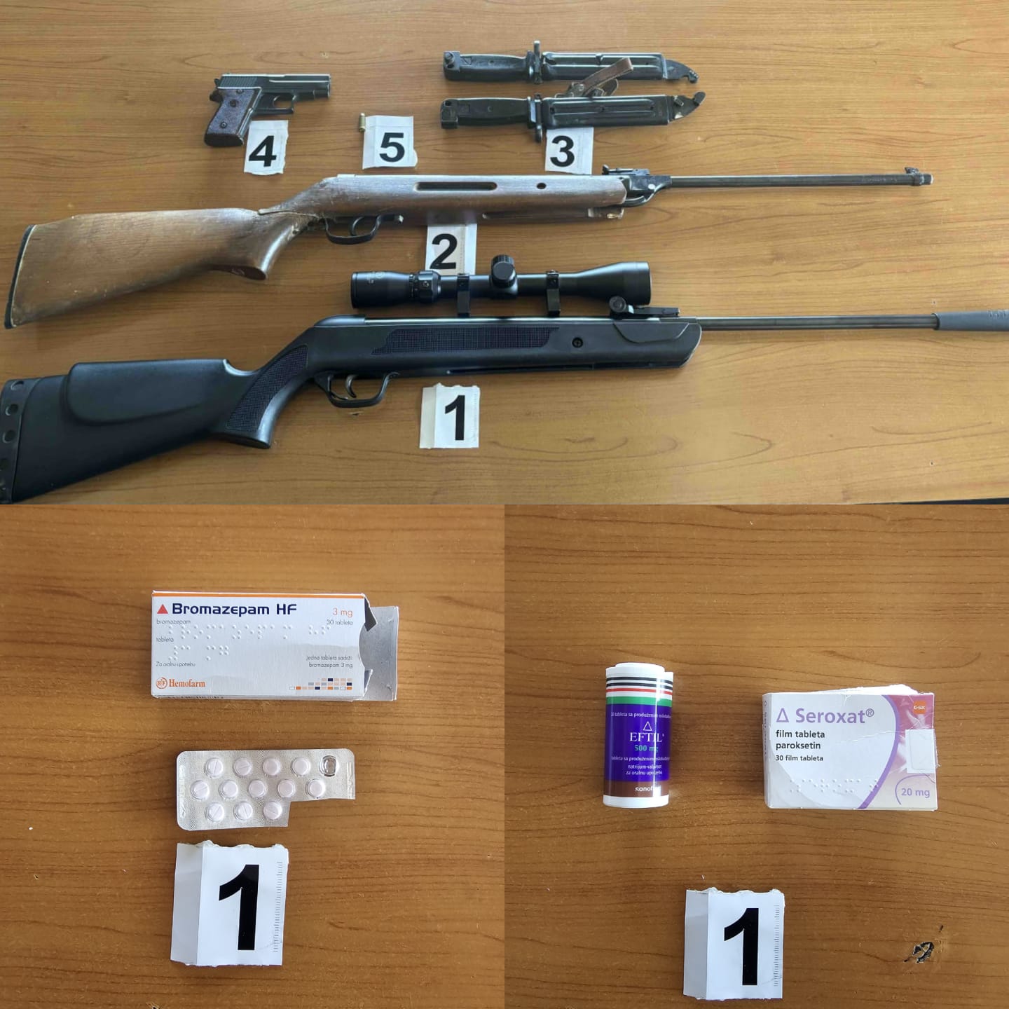 „Pretresom kod operativno interesantnog lica M.R. iz Berana pronađene su i oduzete dvije puške, pištolj, komad municije i 12 komada tableta sa liste opijata. Nadalje, prilikom pretresa kod OIL lica V.T. takođe iz Berana pronađena su i oduzeta 43 komada tableta sa liste opijata, a kod D.Ć. 29 komada“, navodi se u saopštenju.