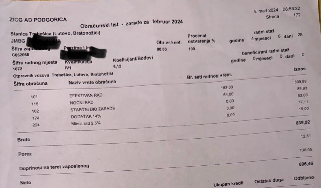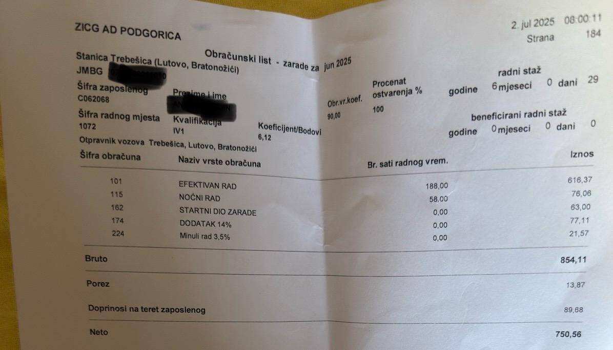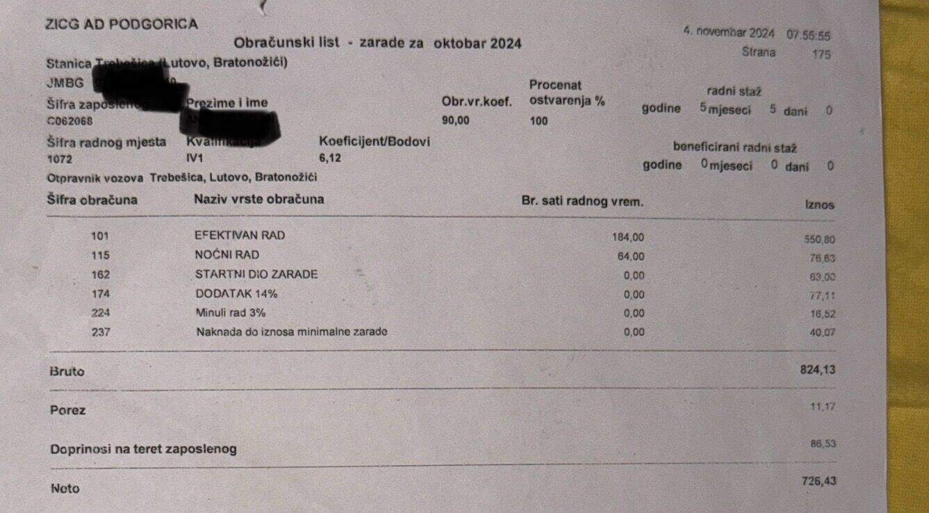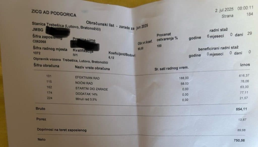 Naše zarade iznose svega 680 do 800 €, i to sa uključenim noćnim radom i 35 godina staža. To su najniže zarade u Crnoj Gori, iako upravo mi snosimo ključnu ulogu u odvijanju i bezbjednosti željezničkog saobraćaja. Dostavljamo platne liste cjelokupnoj javnosti Crne Gore kao dokaz, a ne prazne riječi.