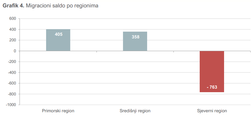 Posmatrano po regionima, u sjevernom je evidentiran negativan migracioni saldo – odselile su se 763 osobe.
