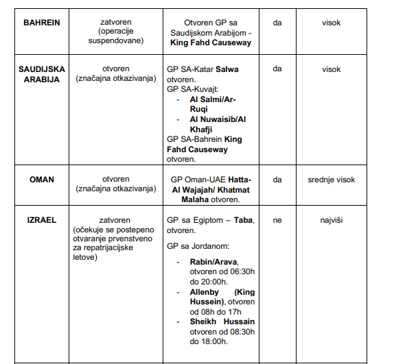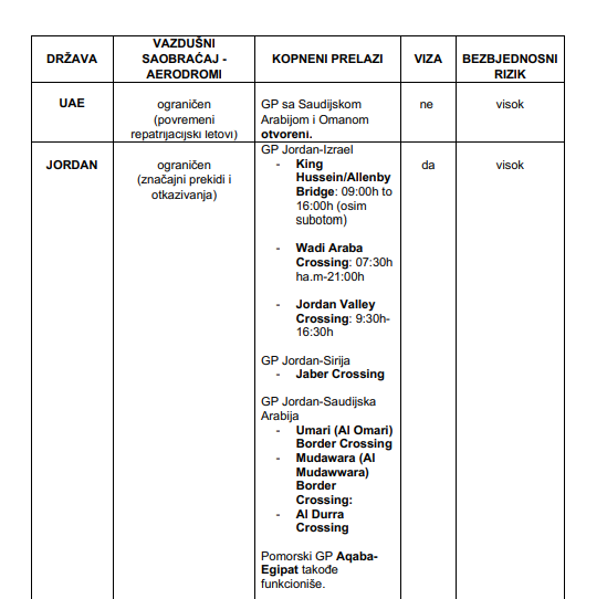 Oni su medijima proslijedili i prikaz bezbjednosne situacije po državama, koji sadrži pregled procijenjenog nivoa bezbjednosnog rizika, status međunarodnog vazdušnog saobraćaja, režim funkcionisanja kopnenih graničnih prelaza i informacije o viznom režimu za državljane Crne Gore, a koji prenosimo u nastavku: