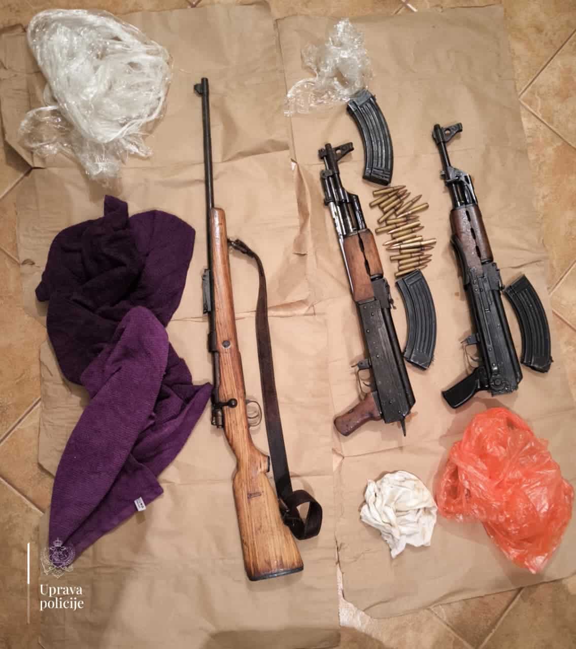 “Pretresom kuće koju ovo lice koristi u mjestu Komani, pronađene su i oduzete tri puške, od čega dvije automatske, 20 komada municije nepoznatog kalibra i tri okvira za pušku, dok je pretresom stana ovog lica pronađena kutija za pištolj sa dva okvira od pištolja i sredstva za vezivanje – lisice”, navod up.