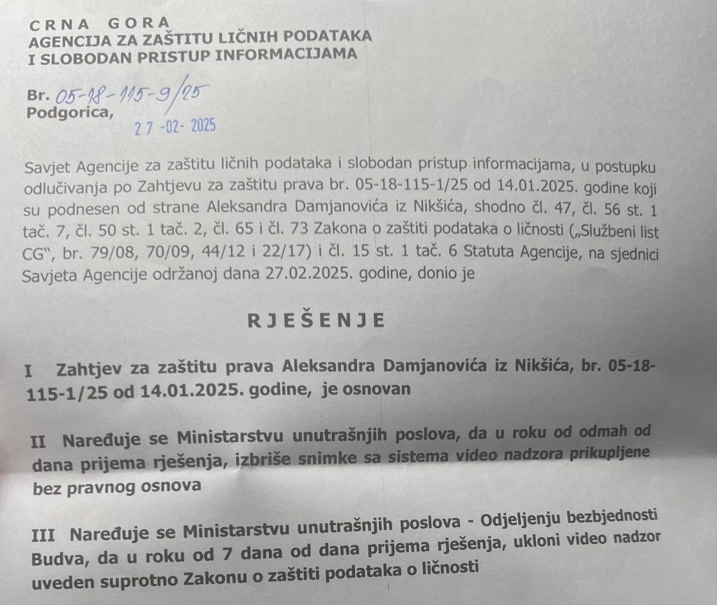 Prilikom boravka u prostorijama Odjeljenja bezbjednosti Budva