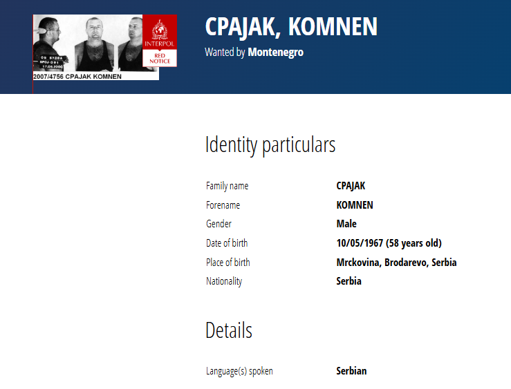 Potjernica za Satkom Adrovićem raspisana je zbog desetogodišnje robije na koju je zbog optužbi za razbojništva i razbojničke krađe, a za Komnenom Cpajakom zbog osude na 30 godina zatvora zbog dvostrukog ubistva u Budvi 2006. godine. On je tada ubio Lazara Draškovića i Mladenku Janković.