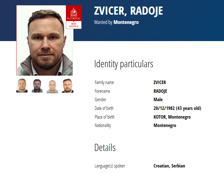 Crvena potjernica Interpola za Radojem Zvicerom, za kojeg policija od 2021. nema podatak gdje se krije, javno je objavljena u maju 2025. godine – zbog sumnje da je počinio više krivičnih djela – ubistva, šverc droge, protivzakonito nošenje oružja…