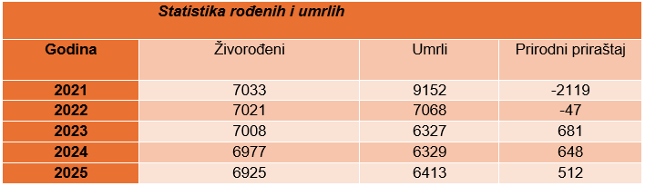 U posljednjih pet godina, najviše djece rodilo se 2021 – njih 7.033. Iste godine je, međutim, zbog kovid pandemije, došlo do naglog porasta broja umrlih (9.152), što je prouzrokovalo i povećanje negativnog prirodnog priraštaja (-2.119).