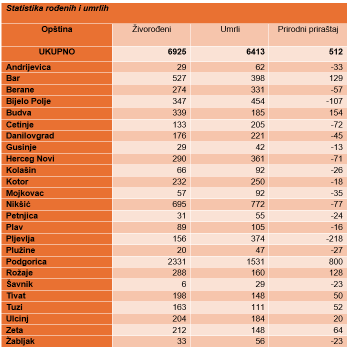 Najveći doprinos rastu stanovništva dala je Podgorica – u glavnom gradu je zabilježen prirodni priraštaj od 800, odnosno rođeno je 2.331 dijete, a 1.531 osoba je preminula.