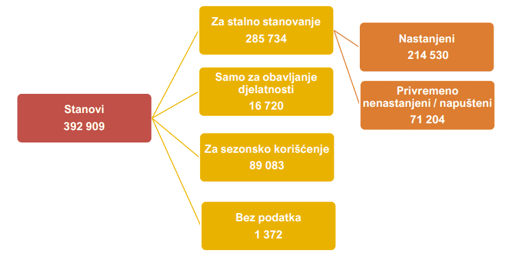 Kako navode u Upravi za statistiku, 72,72 odsto koristi se za stalno stanovanje, 4,26 posto samo za obavljanje djelatnosti, 22,67 za sezonsko korišćenje, dok je 0,35 odsto stanova bez podatka o načinu korišćenja.
