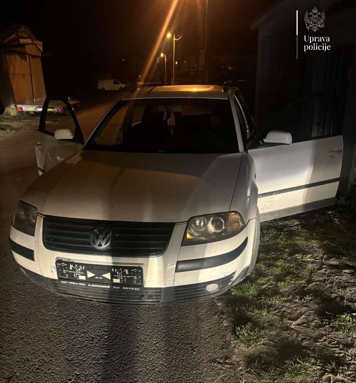 Iz Uprave policije je saopšteno da su tokom ciljane kontrole i zaustavljanja automobila marke “VW Passat”, bez registarskih oznaka iz auta pobjegla dva nepoznata muškarca, dok je vozač identifikovan kao A.S. (32) iz Berana.