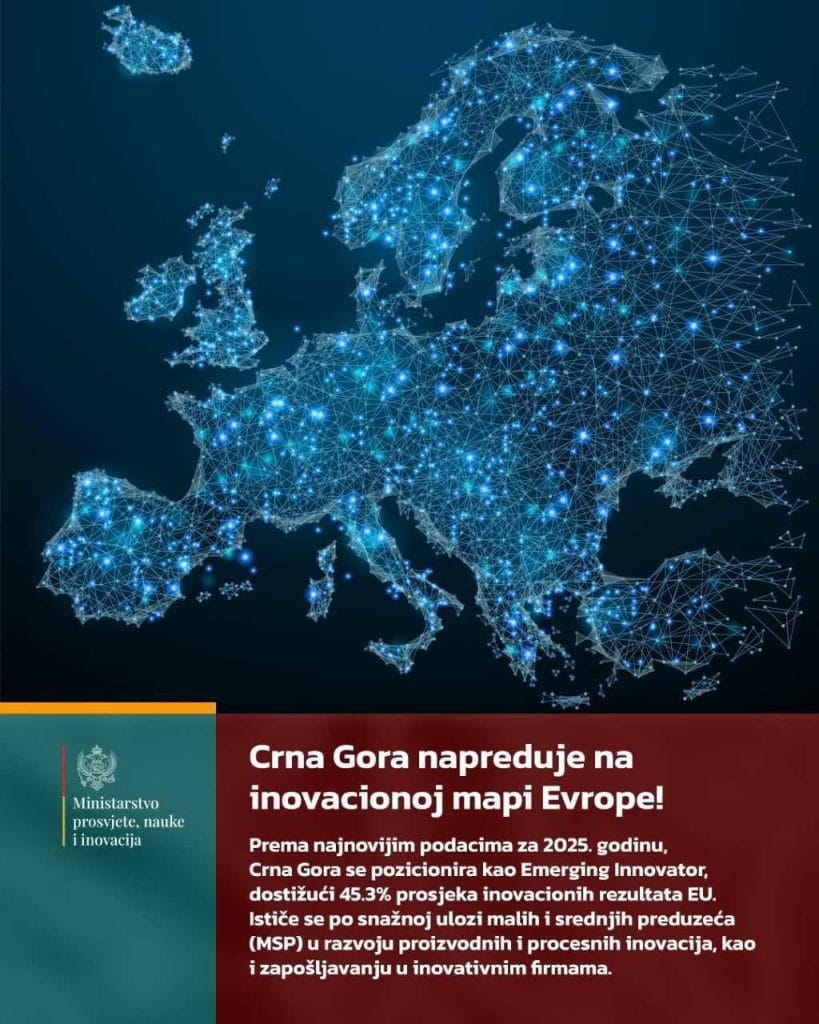 Prema najnovijim podacima za 2025. godinu, Crna Gora se pozicionira kao Emerging Innovator, dostižući 45.3 odsto prosjeka inovacionih rezultata EU. Ističe se po snažnoj ulozi malih i srednjih preduzeća (MSP) u razvoju proizvodnih i procesnih inovacija, kao i zapošljavanju u inovativnim firmama, saopštilo je Ministarstvo prosvjete, nauke i inovacija.