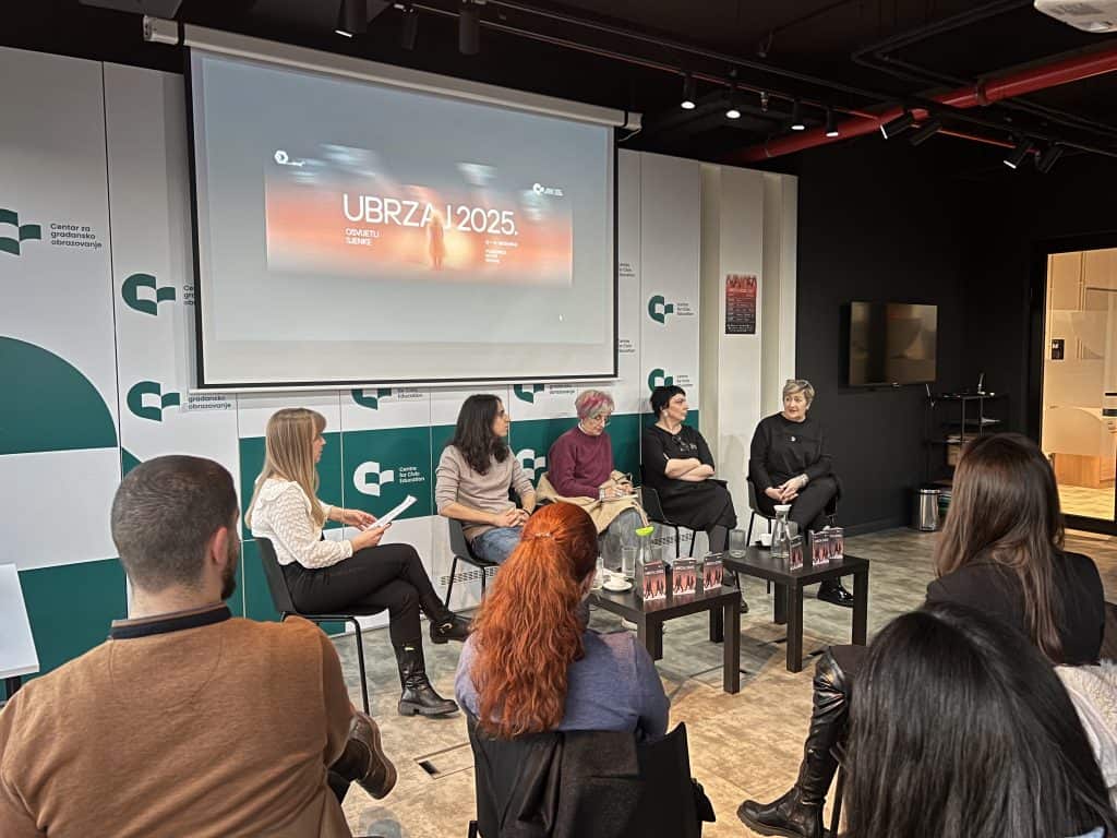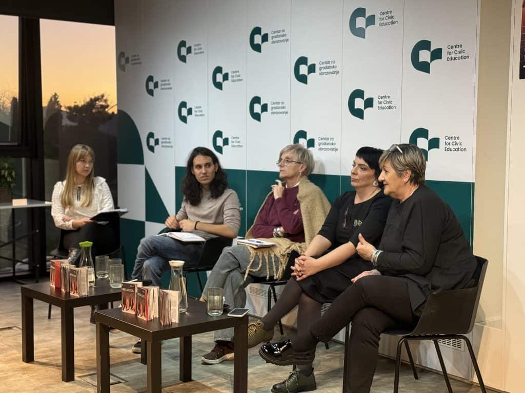 Sa Sabinom Talović, mirovnom aktivistkinjom, Ervinom Dabižinović, koordinatorkom u Centru za žensko i mirovno obrazovanje ANIMA, Milenom Perović Korać, glavnom i odgovornom urednicom nedjeljnika Monitor, i Dušanom Pajovićem, aktivistom, razgovarala je Maja Marinović, saradnica na programima u CGO-u.
