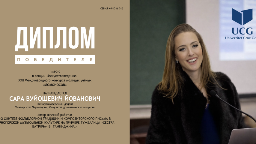 “Doc. dr Sara Vujošević-Jovanović učestvovala je u kategoriji mladih naučnika u dobi do 40 godina i osvojila Prvu nagradu u tematskoj oblasti „Nauka o umjetnosti“ sa radom pod nazivom: „O sintezi folklorne tradicije i kompozitorskog stila u crnogorskoj muzičkoj kulturi na primjeru tužbalice ‘Sestra Batrića’ B. Tamindžića“ “, naveli su iz UCG.