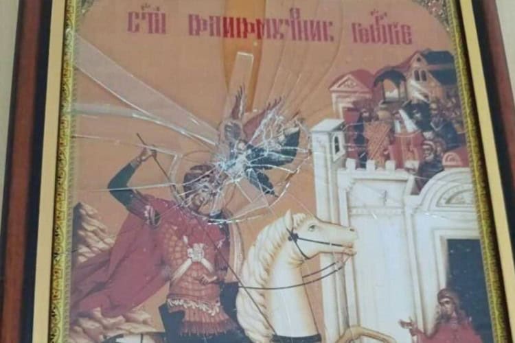 Povrijeđenom, zakrvavljenom rukom prelazio je preko unutrašnjih zidova crkve, usput razbivši dvije vaze za cvijeće, staklo uokvirene ikone, a usljed pada stola za paljenje svijeća oštetio je gornju limenu ploču koja se potpuno savila.