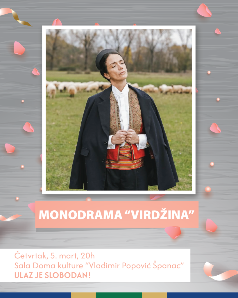 Na istom mjestu će u četvrtak, 5. marta, publika moći da isprati monodramu „Virdžina“ u izvođenju glumice Marte Ćeranić. Po tekstu Dušana Jankovića, predstava donosi intimnu i potresnu priču o životu žene koja je primorana da preuzme ulogu muškarca, noseći teško breme odluka koje su drugi donijeli umjesto nje. Kroz snažnu scensku interpretaciju fenomena virdžine, ovaj komad istražuje identitet, snagu i nepokolebljivost ženskog djeteta u određenom istorijskom periodu u Crnoj Gori.