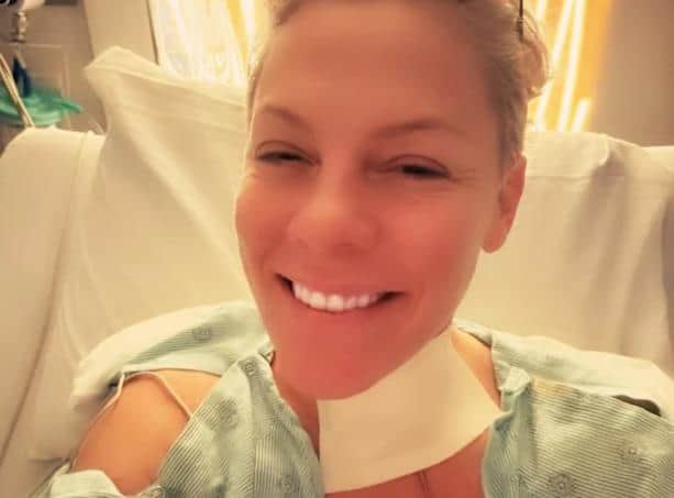 Dok su se kazaljke približavale ponoći, Pink je otkrila da novogodišnju noć provodi sama, oporavljajući se, dok je njena porodica uživala u snoubordingu. Uz osmijeh je objavila selfi iz bolničke sobe – u bolničkoj spavaćici, sa velikim bijelim zavojem oko vrata, ispod kog se videla cevčica.
